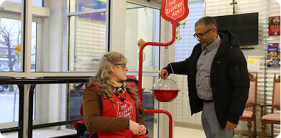 Each Christmas season, volunteers make a difference by greeting donors at our Christmas Kettle locations. Every dollar collected supports local programs and services for those in need.